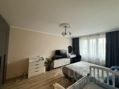 В спальной комнате панорамное окно с видом на двор и центральную аллею. Встроенный конвектор в пол, не перекрывающий вид и увеличивающий световое оконное пространство. В комнате есть встроенный гардероб с продуманной системой хранения вещей (одежда, обувь, спальные пренадлежности, чемоданы и тд). Зеркальные фасады покрыты эмалью с декоративным рисунком из дерева. В дневное время зеркала увеличивают дневным светом пространство. Натяжной потолок, выводы под бра и люстру. На полу качесвенный ламинат.