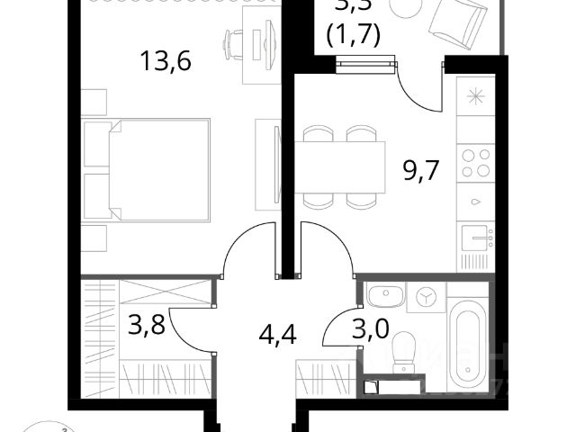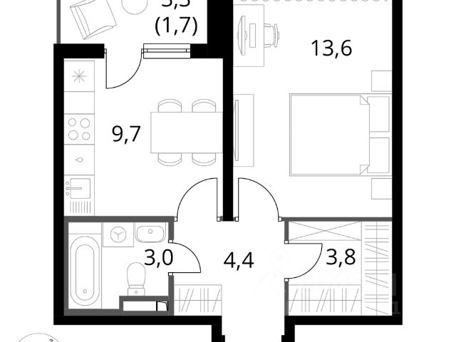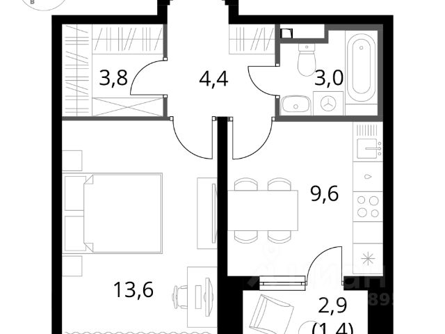 Общая площадь: 38,4 кв.м,