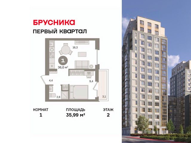 Продаётся с кладовой. Квартира с кухней-гостиной и одной спальней в "Первом квартале". Особенности планировки: балкон, вид во двор, предчистовая отделка. квартиры в нашей базе: МТК01-Ж2.2.2.