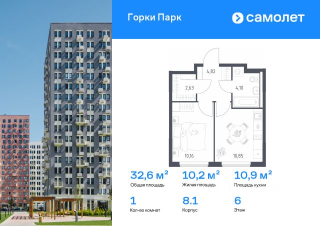 Строим кварталы для жизни с заботой о будущем. Предлагается 1-комнатная квартира комфорт-класса 41,36 кв.м в корпусе 8.1 на 6 этаже, в ЖК "Горки Парк" Квартира с чистовой отделкой. Доступность дополнительных опций уточняйте у застройщика. Приобрести квартиру возможно по специальным акциям от застройщика, с текущими условиями акций можно ознакомиться в блоке "Акций". Цена динамическая и может отличаться, уточняйте актуальность у застройщика. Уединенный жилой комплекс, где хочется остаться. До МКАДа всего 10 минут на авто, а прямо рядом с домами есть лес — идеально для прогулок, занятий спортом и медитаций. Фасады 1117-этажных корпусов дополняют яркие вставки — каждый дом особенный. На территории проекта появятся ФОК и поликлиника, детские сады и школы. Наслаждаться счастливой жизнью в квартале можно уже сейчас — здесь есть готовые дома, но при этом появляются и новые корпуса. "Горки Парк" — это: 1. 10 минут на машине до МКАДа 2. 20 минут на машине до метро "Домодедовская" и 18 минут — до аэропорта Домодедово 3. Пешеходные бульвары и пространства для отдыха 4. Выход в лесопарк с благоустроенными экотропами 5. Приватные дворы без машин 6. Экомаршрут в Коробовском лесопарке рядом с домом, который соединит кварталы: "Пригород Лесное", "Горки Парк" и "Богдановский Лес" 7. Запланировано 3 школы и 6 детских садов 8. Уже построили детский сад и школу со спортивным ядром, где смогут тренироваться жители квартала 9. Поликлиника и спорткомплекс внутри проекта 10. Магазины и кофейни на первых этажах 11. Игровые площадки и воркаут-зона 12. Прогулочная зона рядом с кварталом 13. Спортивно-игровой кластер 14. Площадки для занятий йогой и игры в пинг-понг — в части дворов 15. Рабочий остров и площадка для отдыха — в части дворов 16. Веревочный панда-парк — в будущем 17. Площадка для выгула собак 18. Балконы с панорамным остеклением 19. Увеличенные окна в квартирах 20. Входы на уровне земли 21. Места для хранения велосипедов и колясок