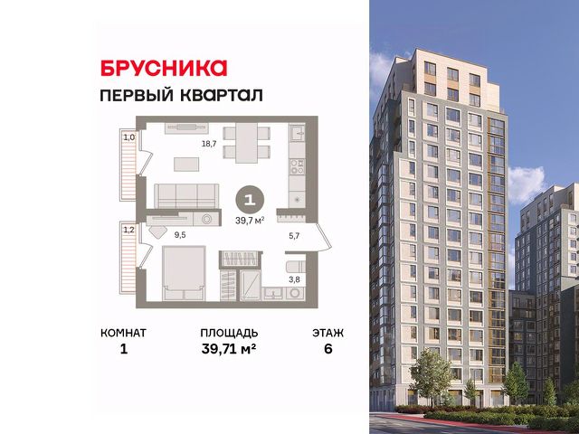 Квартира с кухней-гостиной и одной спальней в "Первом квартале". Особенности планировки: балкон, вид во двор, постирочная, предчистовая отделка. квартиры в нашей базе: МТК03-Ж2.6.8.
