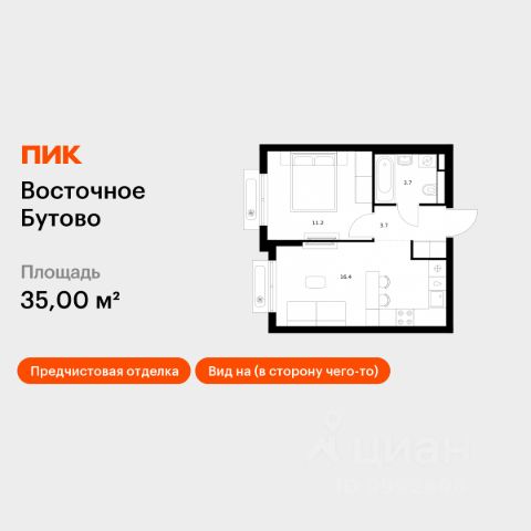 Продаётся 1-комн. квартира площадью 35,5 кв.м на 20 этаже 25 этажного дома (Корпус 41, Секция 3) проекта ПИК Восточное Бутово. Светлый просторный подъезд на уровне земли, функциональная планировка, большие окна, c отделкой. Жилой квартал "Восточное Бутово" расположен в 5 км от МКАД по Симферопольскому шоссе, в Ленинском районе Московской области. Это экологически благоприятное место по соседству с Бутовским лесопарком. В 25 минутах на машине - станции метро и МЦД "Бутово". В "Восточном Бутово" уже открылись пять детских садов из десяти запланированных и одна школа из четырёх. Внутри квартала будет две поликлиники, одна из которых уже работает. В проекте два пешеходных бульвара - по одному из них уже можно гулять и кататься на велосипеде. В закрытых дворах-парках не будет автомобилей - мы построим многоуровневый паркинг, чтобы сделать район ещё более комфортным и безопасным для жителей. Артикул 643539 (Застройщик ООО "Лотан")