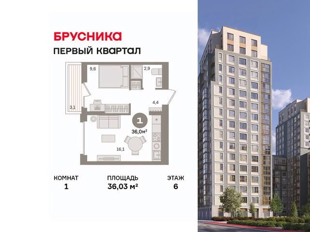 Квартира с кухней-гостиной и одной спальней в "Первом квартале". Особенности планировки: балкон, вид во двор, предчистовая отделка. квартиры в нашей базе: МТК01-Ж5.6.7.