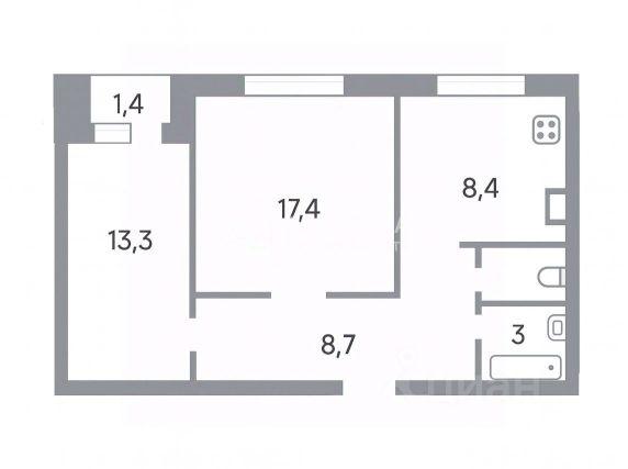 Квартира площадью 56 кв.м. (в ЕРГН 52,7 кв.м.). Комната 13,3 кв.м. с лоджией 3,3 кв.м., зал 17,3 кв.м. (шкаф-купе 4 секционный, кондиционер, стол компьютерный, тумба, журнальный столик, люстра), кухня 8,6 кв.м. (кухонный гарнитур, варочная панель, духовой шкаф, вытяжка, кухонный уголок, стулья, кухонный стол), коридор 9 кв.м., ванная 3,1 кв.м., раздельный санузел 1 кв.м..