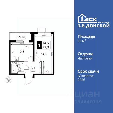 Квартира общей площадью 40.4 кв. м, с лоджией - 44,6 кв.м, потолки высотой 2,8 м.