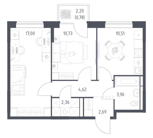 Квартира площадью 56 кв.м. (в ЕРГН 52,7 кв.м.). Комната 13,3 кв.м. с лоджией 3,3 кв.м., зал 17,3 кв.м. (шкаф-купе 4 секционный, кондиционер, стол компьютерный, тумба, журнальный столик, люстра), кухня 8,6 кв.м. (кухонный гарнитур, варочная панель, духовой шкаф, вытяжка, кухонный уголок, стулья, кухонный стол), коридор 9 кв.м., ванная 3,1 кв.м., раздельный санузел 1 кв.м..