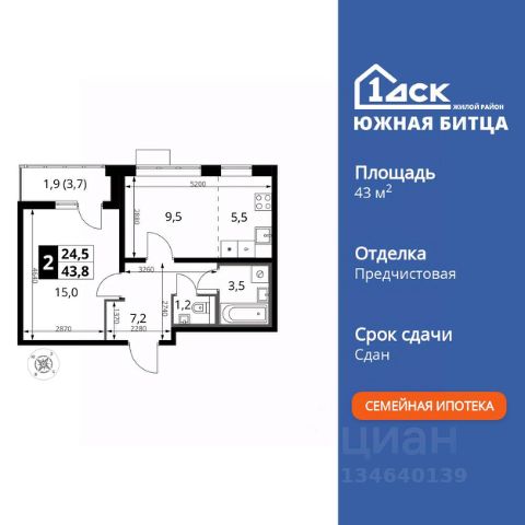 Прямая продажа от застройщика! Семейный жилой район класса Комфорт Плюс Продаётся 2-к квартира номер 18 общей площадью 43.9 кв.м. на 4-м этаже 22 этажного здания. Отделка Whitebox. Особенности квартиры: - Линейная планировка - максимальная функциональность и удобство. - Увеличенное количество окон - дополнительное освещение и свежий воздух. - Гостевой санузел - комфорт и удобство для ваших гостей. - Раздельный санузел - больше удобства для всех членов семьи. - Евроформат - просторное и удобное жилье с отличной планировкой. - Ниша под шкаф - компактное и удобное место для вещей. - Лоджия - уютное место для отдыха и тишины. Квартира с предчистовой отделкой (White box). Вам не придется заниматься черновыми и трудоёмкими работы, а чистовую отделку и дизайн - сделайте на свой вкус. Информация о комплексе: Сочетание свободного перемещения по внутреннней территории без машин и ощущения абсолютной безопасности благодаря надежным ограждениям - вот что отличает ЖК Южная Битца. На территории комплекса созданы все условия как для активного образа жизни, так и для спокойного времяпрепровождения. Свободно перемещайтесь по внутренней территории в безбарьерной среде! Продуманное зонирование во дворах позволяет отделить тихие зоны для родителей со спящими младенцами и тех, кто хочет почитать на свежем воздухе, от шумных игровых зон. Игровые зоны учитывают возраст детей. Площадки для детей старшего возраста вынесены за пределы дворов. Ощущение уютного дома должно начинаться с подъезда. Мы постарались предусмотреть все нюансы, чтобы наши лифты отвечали самым строгим современным требованиям. А наличие кладовых позволит вам поддерживать идеальный порядок и уют в вашей квартире! Транспортная доступность: В 3 км от МКАД в нескольких минутах езды до трех станций метро: Аннино, Бульвар Дмитрия Донского, улица Старокочаловская и станции МЦД2 - жд Бутово. Внутренняя инфраструктура: Для жителей жилого района "Южная Битца" доступна развитая инфраструктура близлежащих московских районов Чертаново, Южное, Бирюлёво Западное, Северное Бутово и Южное Бутово. Множество образовательных учреждений, объекты здравоохранения, торговые и развлекательные центры, кинотеатры, кафе, рестораны, парки.