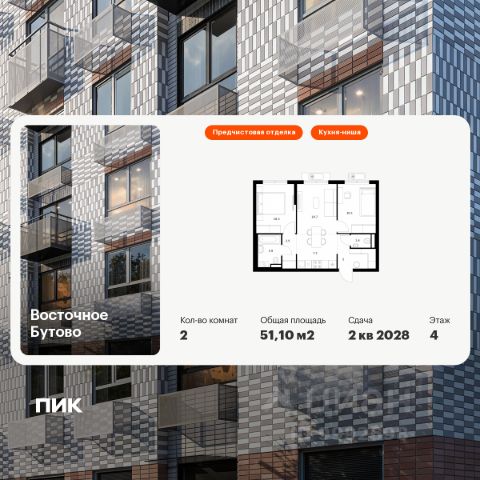 Продаётся 2-комн. квартира площадью 51,1 кв.м на 4 этаже 25 этажного дома (Корпус 47, Секция 3) проекта ПИК Восточное Бутово. Светлый просторный подъезд на уровне земли, функциональная планировка, большие окна, предчистовая отделка. Жилой квартал "Восточное Бутово" расположен в 5 км от МКАД по Симферопольскому шоссе, в Ленинском районе Московской области. Это экологически благоприятное место по соседству с Бутовским лесопарком. В 25 минутах на машине - станции метро и МЦД "Бутово". В "Восточном Бутово" уже открылись пять детских садов из десяти запланированных и одна школа из четырёх. Внутри квартала будет две поликлиники, одна из которых уже работает. В проекте два пешеходных бульвара - по одному из них уже можно гулять и кататься на велосипеде. В закрытых дворах-парках не будет автомобилей - мы построим многоуровневый паркинг, чтобы сделать район ещё более комфортным и безопасным для жителей. Артикул 642398 (Застройщик ООО "Лотан")
