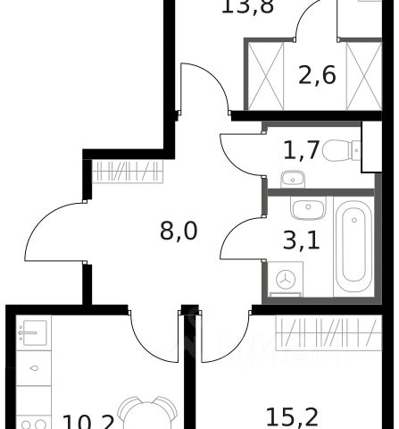 Квартира с кухней-гостиной и двумя спальнями в "Первом квартале". Особенности планировки: вид во двор, гардеробная, лоджия, мастер-спальня, предчистовая отделка, разнесённые спальни. квартиры в нашей базе: МТК02-Ж1.5.6.