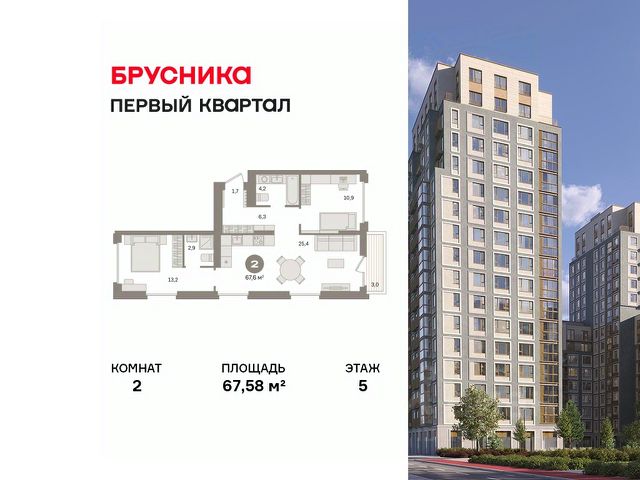 Квартира с кухней-гостиной и двумя спальнями в "Первом квартале". Особенности планировки: вид во двор, второй санузел, гардеробная, лоджия, мастер-спальня, предчистовая отделка, французский балкон. квартиры в нашей базе: МТК07-Ж1.5.6.