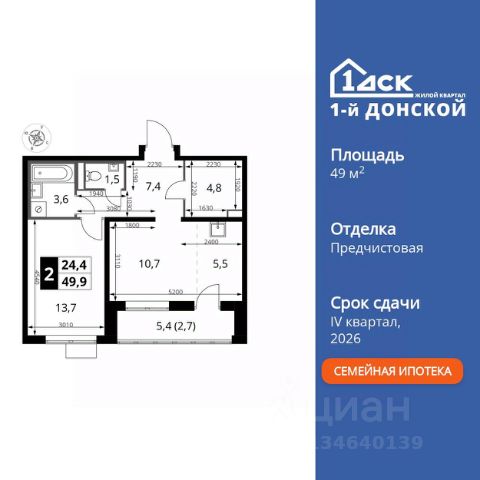 Прямая продажа от застройщика! Жилой Комплекс класса Комфорт Плюс. Продаётся 2-к квартира номер 769 общей площадью 49.9 кв.м. на 5-м этаже 24 этажного здания. Предчистовая отделка. Особенности квартиры: - МЦД-5 в пешей доступности - Квартал с собственной набережной - Свои 2 детских сада и школа - Организуем показ в удобное для вас время! - Линейная планировка - максимальная функциональность и удобство. - Евроформат - просторное и удобное жилье с отличной планировкой. - Гардеробная - удобство для хранения и организации вещей. - Просторная лоджия - идеальное место для уютных вечеров. Квартира с предчистовой отделкой. Вам не придется заниматься черновыми и трудоёмкими работы, а чистовую отделку и дизайн - сделайте на свой вкус. Информация о комплексе: ЖК "1-й Донской" в 7 км от МКАД: гармония городского комфорта и природы. Квартиры на 2-3 стороны света, форма секций и разная этажность создают динамичную архитектуру. Тёплая палитра фасадов и подсветка подчеркивают образ. Рядом - Ермолинский парк, Видновский лесопарк и Жуковский парк. Природа воздействует на все уровни восприятия: от видов до звуков и ароматов. Идеальный баланс для жизни в гармонии с окружающей средой. Транспортная доступность: Комплекс удобно расположен в 7 км от МКАД по трассе М-4 Дон (через Видное). Расстояние до Каширского шоссе составляет 12 км. Добраться до метро и центра Москвы позволяет развитая сеть маршрутов общественного наземного транспорта. Действующая ж/д станция Калинина Павелецкого направления в 15-17 минутах ходьбы (МЦД-5 в 2025-2026 гг). Внутренняя инфраструктура: "1-й Донской": продуманная среда в развивающемся районе. На территории - муниципальные школа и 2 детских сада, поликлиника, торговый центр с площадью для мероприятий. Сеть пешеходных маршрутов ведёт к магазинам и кафе, отделённым от дорог зелёными фито-стенами. Сквозные подъезды с панорамным остеклением и входами с улицы и двора наполнены светом. Всё для комфортной жизни в шаговой доступности, от повседневных нужд до общественных пространств. Квартира с предчистовой отделкой - ваш дизайн без черновых работ