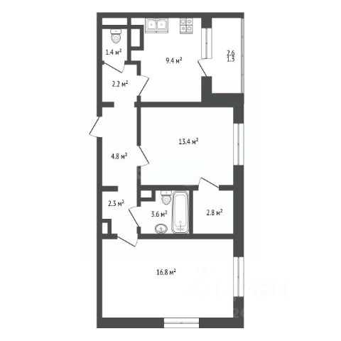 Евро-двушка 46.3м2, жилая комната 1 - 19,1 м2, жилая комната 2 - 11,3 м2, кухня-ниша 5 м2, с/у совмещенный 4,2 м2, холл 7 м2, огромная лоджия из спальни.