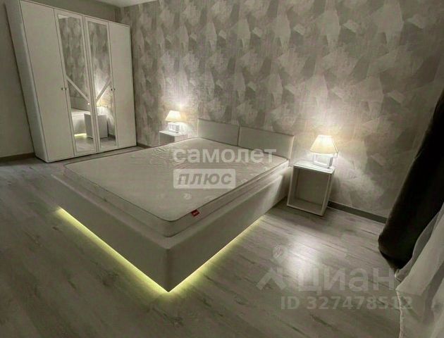 Спальня: двуспальная кровать с мягким велюровым основанием и подъемным механизмом, сочетается с мягкими стеновыми панелями, подвесные прикроватные тумбы декорированы стеновыми рифлеными панелями, дизайнерский свет, дорогой встроенный 6-створчатый шкаф длина 4 метра со встроенными системами хранения во всю стену с качественной фурнитурой.