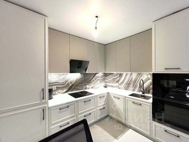 Кухня гостиная: оснащена столешницей из натурального камня, на полу и в зоне фартука крупноформатный керамогранит, оборудован остров. В гарнитур встроены холодильник, варочная панель, духовка, микроволновка, вытяжка, стиральная и сушильные машины для белья. ТВ зона со стеклянным гарнитуром. Мягкие кресла.