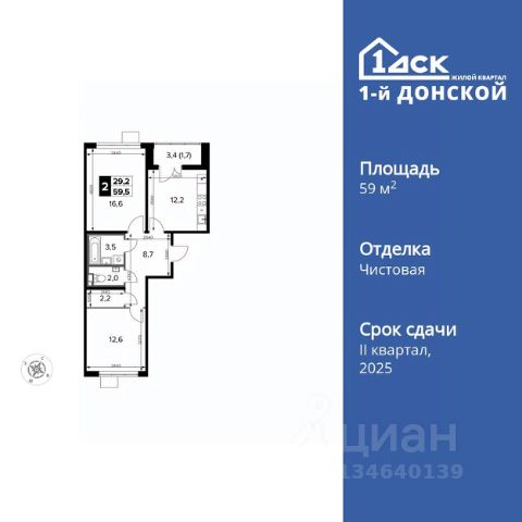 Продаётся 2-к квартира номер 399 общей площадью 59 кв.м. на 3-м этаже 20 этажного здания. Отделка Whitebox. Цена с учётом скидки.