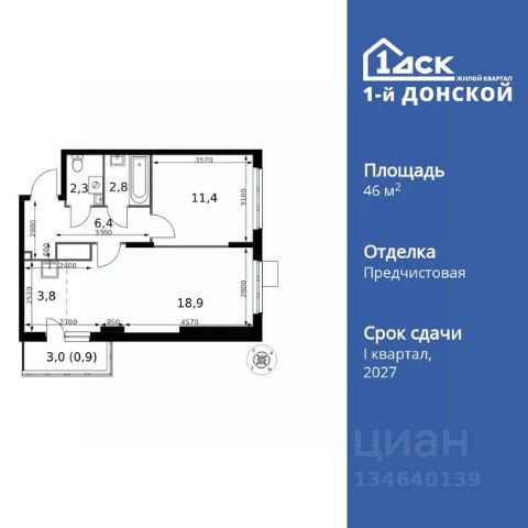 Продаётся 2-к квартира номер 909 общей площадью 57 кв.м. на 23-м этаже 24 этажного дома. Отделка Whitebox.