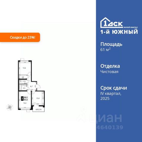 Прямая продажа от застройщика! Жилой Комплекс класса Комфорт Плюс. Продаётся 2-к квартира номер 114 общей площадью 58.3 кв.м. на 6-м этаже 25 этажного здания. Отделка Whitebox. Цена с учётом скидки. Особенности квартиры: - МЦД-5 в пешей доступности - Квартал с южным садом - Свои 3 детских сада и 2 большие школы - Просторная спальня, в которой можно разместить большую кровать. - Линейная планировка - максимальная функциональность и удобство. - Гостевой санузел - комфорт и удобство для ваших гостей. - Раздельный санузел - больше удобства для всех членов семьи. - Просторная кухня - место для семейных ужинов и кулинарных экспериментов. - Просторная мягкая зона - комфорт и уют для отдыха всей семьи. - Возможность добавить спальное место - дополнительный комфорт для гостей. - Гардеробная - удобство для хранения и организации вещей. - Просторная лоджия - идеальное место для уютных вечеров. Квартира с предчистовой отделкой (White box). Вам не придется заниматься черновыми и трудоёмкими работы, а чистовую отделку и дизайн - сделайте на свой вкус. Информация о комплексе: Одно из преимуществ проектов 1- ДСК большие застекленные лоджии. Другое преимущество честный евро-формат. Во всем проекте предусмотрена система Умный дом. В состав устанавливаемого пакета устройств входит: WiFi реле для управления группами потребителей, беспроводной кран перекрытия с эл. приводом, беспроводной сенсор протечки, Яндекс Станция Мини. Его расположение можно назвать удачным за счет транспортной доступности и близости к природным объектам. По соседству лес, а в каждом дворе плодовые деревья. Весной квартал окутывает бело-розовое облако: это цветут яблони, груши, сливы. К августу в воздух наполняется ароматом созревших плодов. Зимой среди покрытых инеем деревьев протянулась лыжня. Транспортная доступность: - Общественный транспорт: Действующая ж/д станция Булатниково (в перспективе будущая МДЦ D5) в пешей доступности, всего 10-12 минут. - Личный автотранспорт: Удобный выезд на трассу М4-Дон в сторону Москвы и области 850 м, до МКАД - 1 км Внутренняя инфраструктура: Красивые продуманные подъезды - еще одно преимущество проекта 1-й Южный. Вход в сквозные подъезды есть и с улицы, и со двора. Благодаря сплошному остеклению в них всегда светло и уютно. Подъезды расположены на уровне земли, поэтому и молодым родителям с коляской, и жильцам с ограниченными возможностями вход и выход неудобств не доставят. В помещении предусмотрено место под стойку ресепшен с выводом инженерных сетей. Если жильцы решат на общем собрании, что необходим охранник или консьерж, организовать для них рабочее место можно быстро и с минимальными затратами. В подъездах предусмотрены уборные для детей и взрослых. Колясочные в каждом подъезде позволяют поддерживать порядок и чистоту на этажах. На случай прогулки с четвероногим питомцем в непогоду в подъездах устроены лапомойки. Во дворах и на общественных территориях 1-ого Южного столько всего интересного для юных обита Продается 2-комнатная квартира первичка в Видном.