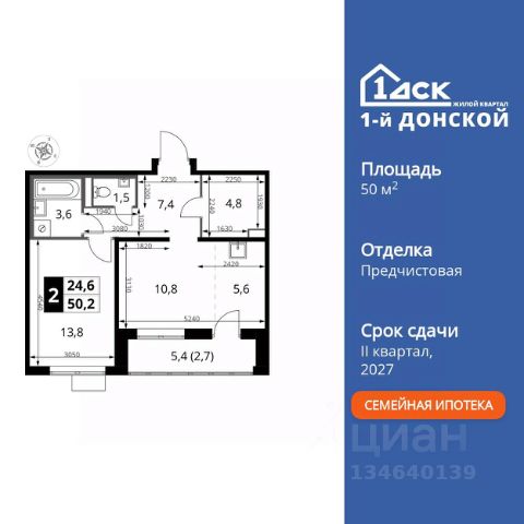 Прямая продажа от застройщика! Жилой Комплекс класса Комфорт Плюс. Продаётся 2-к квартира номер 218 общей площадью 53.1 кв.м. на 11-м этаже 24 этажного здания. Предчистовая отделка. Цена с учётом скидки. Особенности квартиры: - МЦД-5 в пешей доступности - Квартал с собственной набережной - Свои 2 детских сада и школа - Организуем показ в удобное для вас время! - Просторная спальня, в которой можно разместить большую кровать. - Линейная планировка - максимальная функциональность и удобство. - Раздельный санузел - больше удобства для всех членов семьи. - Просторная мягкая зона - комфорт и уют для отдыха всей семьи. - Возможность добавить спальное место - дополнительный комфорт для гостей. - Гардеробная - удобство для хранения и организации вещей. - Просторная лоджия - идеальное место для уютных вечеров. Квартира с предчистовой отделкой. Вам не придется заниматься черновыми и трудоёмкими работы, а чистовую отделку и дизайн - сделайте на свой вкус. Информация о комплексе: ЖК "1-й Донской" в 7 км от МКАД: гармония городского комфорта и природы. Квартиры на 2-3 стороны света, форма секций и разная этажность создают динамичную архитектуру. Тёплая палитра фасадов и подсветка подчеркивают образ. Рядом - Ермолинский парк, Видновский лесопарк и Жуковский парк. Природа воздействует на все уровни восприятия: от видов до звуков и ароматов. Идеальный баланс для жизни в гармонии с окружающей средой. Транспортная доступность: Комплекс удобно расположен в 7 км от МКАД по трассе М-4 Дон (через Видное). Расстояние до Каширского шоссе составляет 12 км. Добраться до метро и центра Москвы позволяет развитая сеть маршрутов общественного наземного транспорта. Действующая ж/д станция Калинина Павелецкого направления в 15-17 минутах ходьбы (МЦД-5 в 2025-2026 гг). Внутренняя инфраструктура: "1-й Донской": продуманная среда в развивающемся районе. На территории - муниципальные школа и 2 детских сада, поликлиника, торговый центр с площадью для мероприятий. Сеть пешеходных маршрутов ведёт к магазинам и кафе, отделённым от дорог зелёными фито-стенами. Сквозные подъезды с панорамным остеклением и входами с улицы и двора наполнены светом. Всё для комфортной жизни в шаговой доступности, от повседневных нужд до общественных пространств. Квартира с предчистовой отделкой - ваш дизайн без черновых работ