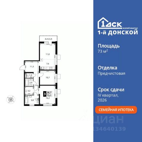 Прямая продажа от застройщика! Жилой Комплекс класса Комфорт Плюс. Продаётся 3-к квартира номер 448 общей площадью 73.1 кв.м. на 21-м этаже 24 этажного здания. Предчистовая отделка. Цена с учётом скидки. Особенности квартиры: - МЦД-5 в пешей доступности - Квартал с собственной набережной - Свои 2 детских сада и школа - Организуем показ в удобное для вас время! - Мастер-зона с санузлом и гардеробной. Всё для вашего комфорта и удобства, включая личный санузел и гардероб. - Просторная спальня, в которой можно разместить большую кровать. - Распашная планировка - отличное сочетание удобства и свободы. - Окно в ванной - натуральное освещение для уюта и комфорта. - Гостевой санузел - комфорт и удобство для ваших гостей. - Раздельный санузел - больше удобства для всех членов семьи. - Евроформат - просторное и удобное жилье с отличной планировкой. - Кухня-гостиная - идеальное пространство для встреч с близкими. - Гардеробная - удобство для хранения и организации вещей. - Просторная лоджия - идеальное место для уютных вечеров. Квартира с предчистовой отделкой. Вам не придется заниматься черновыми и трудоёмкими работы, а чистовую отделку и дизайн - сделайте на свой вкус. Информация о комплексе: ЖК "1-й Донской" в 7 км от МКАД: гармония городского комфорта и природы. Квартиры на 2-3 стороны света, форма секций и разная этажность создают динамичную архитектуру. Тёплая палитра фасадов и подсветка подчеркивают образ. Рядом - Ермолинский парк, Видновский лесопарк и Жуковский парк. Природа воздействует на все уровни восприятия: от видов до звуков и ароматов. Идеальный баланс для жизни в гармонии с окружающей средой. Транспортная доступность: Комплекс удобно расположен в 7 км от МКАД по трассе М-4 Дон (через Видное). Расстояние до Каширского шоссе составляет 12 км. Добраться до метро и центра Москвы позволяет развитая сеть маршрутов общественного наземного транспорта. Действующая ж/д станция Калинина Павелецкого направления в 15-17 минутах ходьбы (МЦД-5 в 2025-2026 гг). Внутренняя инфраструктура: "1-й Донской": продуманная среда в развивающемся районе. На территории - муниципальные школа и 2 детских сада, поликлиника, торговый центр с площадью для мероприятий. Сеть пешеходных маршрутов ведёт к магазинам и кафе, отделённым от дорог зелёными фито-стенами. Сквозные подъезды с панорамным остеклением и входами с улицы и двора наполнены светом. Всё для комфортной жизни в шаговой доступности, от повседневных нужд до общественных пространств. Квартира с предчистовой отделкой - ваш дизайн без черновых работ