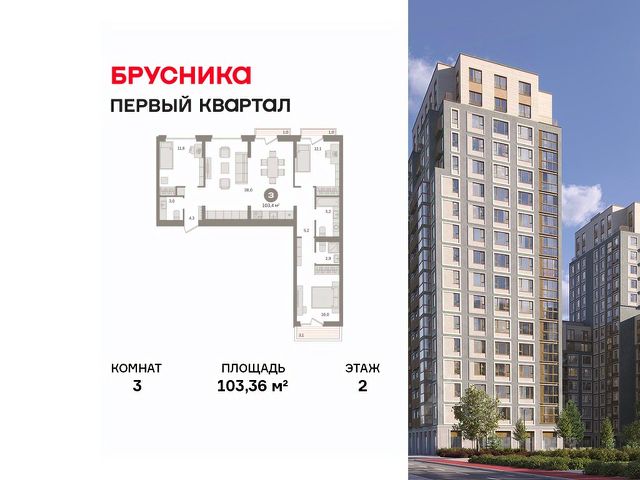 Квартира с кухней-гостиной и тремя спальнями в "Первом квартале". Особенности планировки: вид во двор, второй санузел, гардеробная, лоджия, мастер-спальня, предчистовая отделка, разнесённые спальни. квартиры в нашей базе: МТК06-Ж1.2.6.