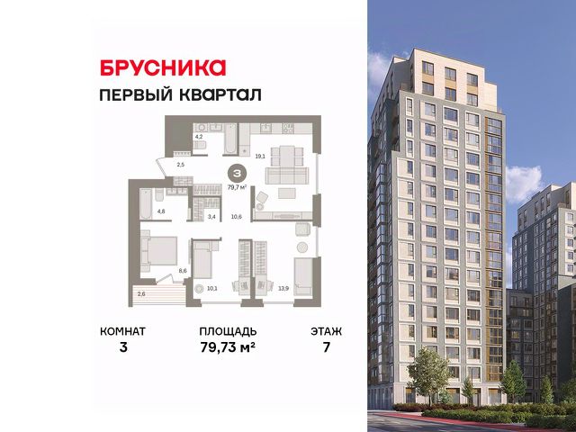 Квартира с кухней-гостиной и тремя спальнями в "Первом квартале". Особенности планировки: гардеробная, лоджия, мастер-спальня, постирочная, предчистовая отделка, французский балкон. квартиры в нашей базе: МТК07-Ж1.7.3.
