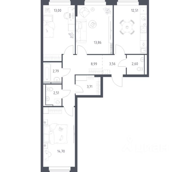 Квартира с кухней-гостиной и тремя спальнями в "Первом квартале". Особенности планировки: балкон, вид во двор, гардеробная, мастер-спальня, окна на две стороны, предчистовая отделка, разнесённые спальни. квартиры в нашей базе: МТК02-Ж2.7.8.