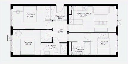 Квартира с кухней-гостиной и тремя спальнями в "Первом квартале". Особенности планировки: балкон, вид во двор, гардеробная, мастер-спальня, предчистовая отделка, разнесённые спальни. квартиры в нашей базе: МТК03-Ж5.9.1.