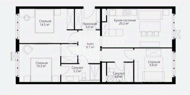 Квартира с кухней-гостиной и тремя спальнями в "Первом квартале". Особенности планировки: балкон, вид во двор, второй санузел, мастер-спальня, постирочная, предчистовая отделка, разнесённые спальни, французский балкон. квартиры в нашей базе: МТК05-Ж3.2.1.