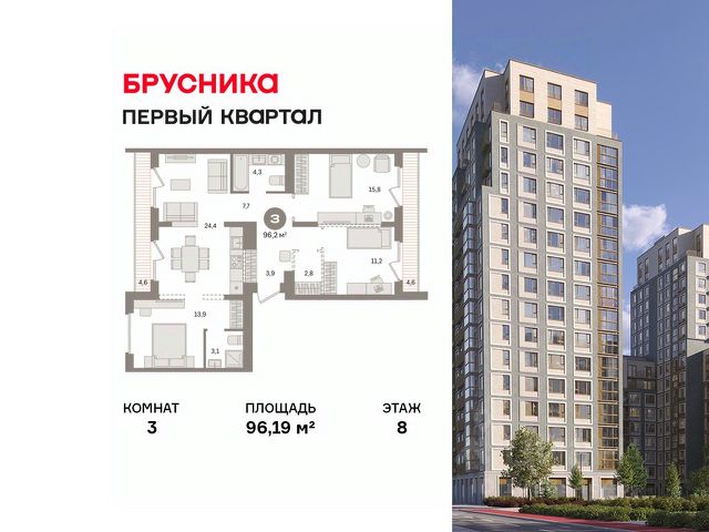 Продаётся с кладовой. Квартира с кухней-гостиной и тремя спальнями в "Первом квартале". Особенности планировки: вид во двор, второй санузел, гардеробная, мастер-спальня, окна на две стороны, предчистовая отделка, разнесённые спальни. квартиры в нашей базе: МТК06-Ж2.9.4.