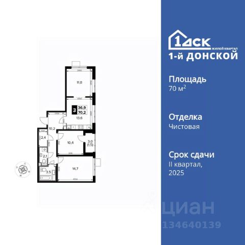 Прямая продажа от застройщика! Жилой Комплекс класса Комфорт Плюс. Продаётся 3-к квартира номер 320 общей площадью 69.3 кв.м. на 7-м этаже 24 этажного здания. Отделка Whitebox. Цена с учётом скидки. Особенности квартиры: - МЦД-5 в пешей доступности - Квартал с собственной набережной - Свои 2 детских сада и школа - Просторная спальня, в которой можно разместить большую кровать. - Гостевой санузел - комфорт и удобство для ваших гостей. - Евроформат - просторное и удобное жилье с отличной планировкой. - Просторная кухня - место для семейных ужинов и кулинарных экспериментов. - Просторная мягкая зона - комфорт и уют для отдыха всей семьи. - Возможность добавить спальное место - дополнительный комфорт для гостей. - Гардеробная - удобство для хранения и организации вещей. - Лоджия - уютное место для отдыха и тишины. Квартира с предчистовой отделкой (White box). Вам не придется заниматься черновыми и трудоёмкими работы, а чистовую отделку и дизайн - сделайте на свой вкус. Информация о комплексе: Комплекс 1-й Донской расположен в 7 км от МКАД по трассе М-4 Дон. В нем сочетаются все плюсы комфортной городской среды и природного окружения. В проекте достаточно большой процент квартир, выходящих на 2-3 стороны света. Секции-маяки формируют у зданий визуальную L-форму, что придает застройке структуру и ритмику объемов. На ощущение динамики работает и разная этажность зданий. Теплая цветовая палитра фасадов отражает природу Дона. Вечерами дома преображаются благодаря архитектурной подсветке, выгодно выделяясь на городском фоне. Природа оказывает положительное влияние на человека на всех уровнях восприятия: через зрение, запахи, звуки, тактильные ощущения. Неподалеку от ЖК Первый Донской: Ермолинский парк, Видновский лесопарк, Жуковский парк Транспортная доступность: Комплекс удобно расположен в 7 км от МКАД по трассе М-4 Дон (через Видное). Расстояние до Каширского шоссе составляет 12 км. Добраться до метро и центра Москвы позволяет развитая сеть маршрутов общественного наземного транспорта. Действующая ж/д станция Калинина Павелецкого направления в 15-17 минутах ходьбы (МЦД-5 в 2025-2026 гг). Внутренняя инфраструктура: Проект 1-й Донской соседствует с бурно развивающимся районом, основная инфраструктура которого уже сложилась. В строительстве современных жилых комплексов в округе есть свои плюсы: здесь формируется продуманная и комфортная городская среда. Что касается внутренней инфраструктуры, на территории квартала будут расположены собственные муниципальные 2 детских садика и школа, которые помогут совместить приятное с полезным. Территория комплекса пронизана целой сетью живописных пешеходных маршрутов, позволяющих попасть в любой уголок района. Основные пути, как водится, "торговые". Они проходят вдоль магазинов, кафе и других представителей коммерции и отделяются от проезжей части зеленой "фито" - стеной. Среди крупных социальных объектов предусмотрены своя поликлиника и торговый центр с примыкающей площадью