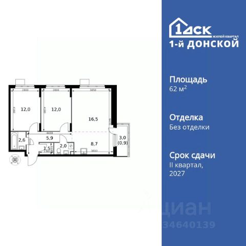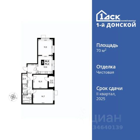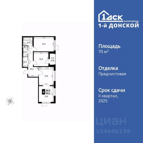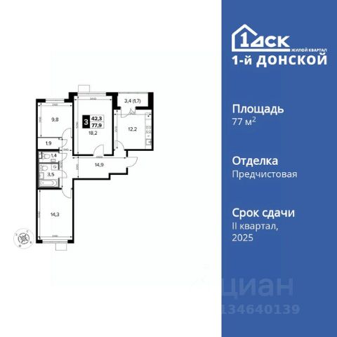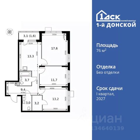 Продаётся 3-к квартира номер 198 общей площадью 76.8 кв.м. на 6-м этаже 24 этажного дома. Чистовая отделка. Дом сдан.