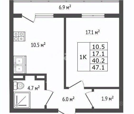 Однокомнатная с большой кухней 10.5 кв. м, общей площадью 47.1 кв. м. Высокий этаж всегда обеспечит много света