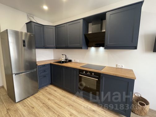 - Кухня: кухонный гарнитур, духовой шкаф, встроенная индукционная панель, микроволновая печь, холодильник, обеденный стол и 3 стула;