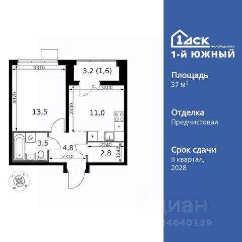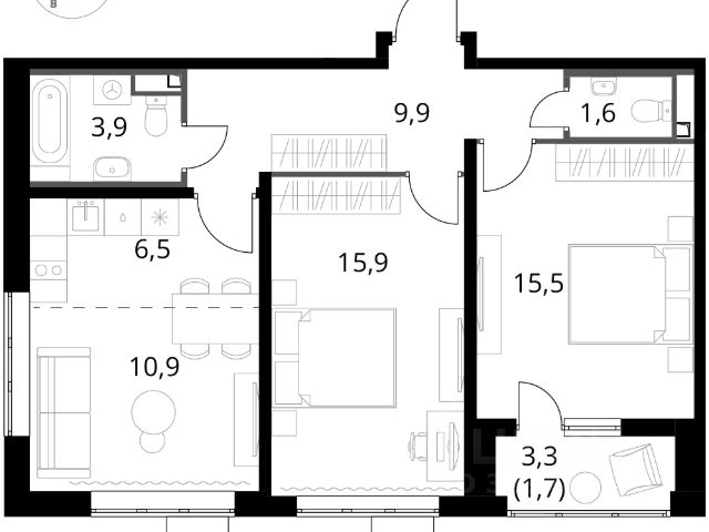 Квартира площадью 56 кв.м. (в ЕРГН 52,7 кв.м.). Комната 13,3 кв.м. с лоджией 3,3 кв.м., зал 17,3 кв.м. (шкаф-купе 4 секционный, кондиционер, стол компьютерный, тумба, журнальный столик, люстра), кухня 8,6 кв.м. (кухонный гарнитур, варочная панель, духовой шкаф, вытяжка, кухонный уголок, стулья, кухонный стол), коридор 9 кв.м., ванная 3,1 кв.м., раздельный санузел 1 кв.м..