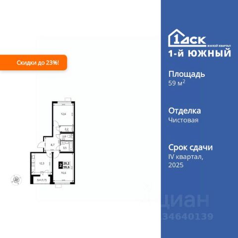 Прямая продажа от застройщика! Жилой Комплекс класса Комфорт Плюс. Продаётся 2-к квартира номер 571 общей площадью 59.6 кв.м. на 11-м этаже 24 этажного здания. Чистовая отделка. Цена с учётом скидки. Особенности квартиры: - МЦД-5 в пешей доступности - Квартал с южным садом - Свои 3 детских сада и 2 большие школы - Просторная спальня, в которой можно разместить большую кровать. - Распашная планировка - отличное сочетание удобства и свободы. - Гостевой санузел - комфорт и удобство для ваших гостей. - Раздельный санузел - больше удобства для всех членов семьи. - Просторная кухня - место для семейных ужинов и кулинарных экспериментов. - Просторная мягкая зона - комфорт и уют для отдыха всей семьи. - Возможность добавить спальное место - дополнительный комфорт для гостей. - Гардеробная - удобство для хранения и организации вещей. - Ниша под шкаф - компактное и удобное место для вещей. - Лоджия - уютное место для отдыха и тишины. Информация о комплексе: Одно из преимуществ проектов 1- ДСК большие застекленные лоджии. Другое преимущество честный евро-формат. Во всем проекте предусмотрена система Умный дом. В состав устанавливаемого пакета устройств входит: WiFi реле для управления группами потребителей, беспроводной кран перекрытия с эл. приводом, беспроводной сенсор протечки, Яндекс Станция Мини. Его расположение можно назвать удачным за счет транспортной доступности и близости к природным объектам. По соседству лес, а в каждом дворе плодовые деревья. Весной квартал окутывает бело-розовое облако: это цветут яблони, груши, сливы. К августу в воздух наполняется ароматом созревших плодов. Зимой среди покрытых инеем деревьев протянулась лыжня. Транспортная доступность: - Общественный транспорт: Действующая ж/д станция Булатниково (в перспективе будущая МДЦ D5) в пешей доступности, всего 10-12 минут. - Личный автотранспорт: Удобный выезд на трассу М4-Дон в сторону Москвы и области 850 м, до МКАД - 1 км Внутренняя инфраструктура: Красивые продуманные подъезды - еще одно преимущество проекта 1-й Южный. Вход в сквозные подъезды есть и с улицы, и со двора. Благодаря сплошному остеклению в них всегда светло и уютно. Подъезды расположены на уровне земли, поэтому и молодым родителям с коляской, и жильцам с ограниченными возможностями вход и выход неудобств не доставят. В помещении предусмотрено место под стойку ресепшен с выводом инженерных сетей. Если жильцы решат на общем собрании, что необходим охранник или консьерж, организовать для них рабочее место можно быстро и с минимальными затратами. В подъездах предусмотрены уборные для детей и взрослых. Колясочные в каждом подъезде позволяют поддерживать порядок и чистоту на этажах. На случай прогулки с четвероногим питомцем в непогоду в подъездах устроены лапомойки. Во дворах и на общественных территориях 1-ого Южного столько всего интересного для юных обитателей. Собственные 3 детских сада и 2 больших школы буквально под окнами Изюминка проекта - пешеходный бульвар-дендра