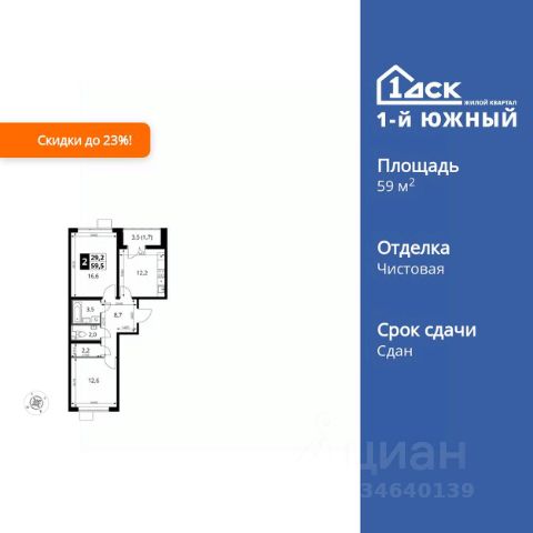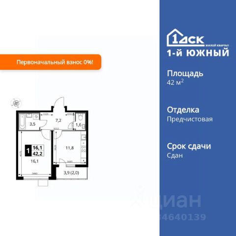 Прямая продажа от застройщика! Жилой Комплекс класса Комфорт Плюс. Продаётся 1-к квартира номер 182 общей площадью 34.4 кв.м. на 16-м этаже 24 этажного здания. Отделка Whitebox. Цена с учётом скидки. Особенности квартиры: - МЦД-5 в пешей доступности - Квартал с южным садом - Свои 3 детских сада и 2 большие школы - Линейная планировка - максимальная функциональность и удобство. - Просторная кухня - место для семейных ужинов и кулинарных экспериментов. - Просторная мягкая зона - комфорт и уют для отдыха всей семьи. - Возможность добавить спальное место - дополнительный комфорт для гостей. - Ниша под шкаф - компактное и удобное место для вещей. - Лоджия - уютное место для отдыха и тишины. Квартира с предчистовой отделкой (White box). Вам не придется заниматься черновыми и трудоёмкими работы, а чистовую отделку и дизайн - сделайте на свой вкус. Информация о комплексе: Одно из преимуществ проектов 1- ДСК большие застекленные лоджии. Другое преимущество честный евро-формат. Во всем проекте предусмотрена система Умный дом. В состав устанавливаемого пакета устройств входит: WiFi реле для управления группами потребителей, беспроводной кран перекрытия с эл. приводом, беспроводной сенсор протечки, Яндекс Станция Мини. Его расположение можно назвать удачным за счет транспортной доступности и близости к природным объектам. По соседству лес, а в каждом дворе плодовые деревья. Весной квартал окутывает бело-розовое облако: это цветут яблони, груши, сливы. К августу в воздух наполняется ароматом созревших плодов. Зимой среди покрытых инеем деревьев протянулась лыжня. Транспортная доступность: - Общественный транспорт: Действующая ж/д станция Булатниково (в перспективе будущая МДЦ D5) в пешей доступности, всего 10-12 минут. - Личный автотранспорт: Удобный выезд на трассу М4-Дон в сторону Москвы и области 850 м, до МКАД - 1 км Внутренняя инфраструктура: Красивые продуманные подъезды - еще одно преимущество проекта 1-й Южный. Вход в сквозные подъезды есть и с улицы, и со двора. Благодаря сплошному остеклению в них всегда светло и уютно. Подъезды расположены на уровне земли, поэтому и молодым родителям с коляской, и жильцам с ограниченными возможностями вход и выход неудобств не доставят. В помещении предусмотрено место под стойку ресепшен с выводом инженерных сетей. Если жильцы решат на общем собрании, что необходим охранник или консьерж, организовать для них рабочее место можно быстро и с минимальными затратами. В подъездах предусмотрены уборные для детей и взрослых. Колясочные в каждом подъезде позволяют поддерживать порядок и чистоту на этажах. На случай прогулки с четвероногим питомцем в непогоду в подъездах устроены лапомойки. Во дворах и на общественных территориях 1-ого Южного столько всего интересного для юных обитателей. Собственные 3 детских сада и 2 больших школы буквально под окнами Изюминка проекта - пешеходный бульвар-дендрарий, он идеален для семейных прогулок. По сторонам прогулочной зоны разместились точки
