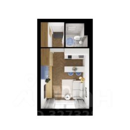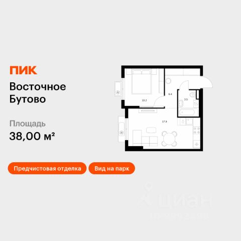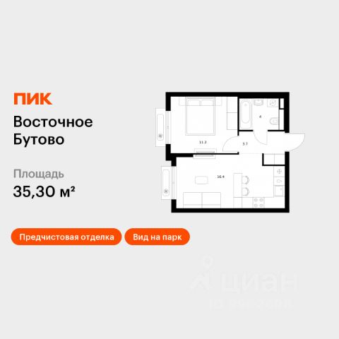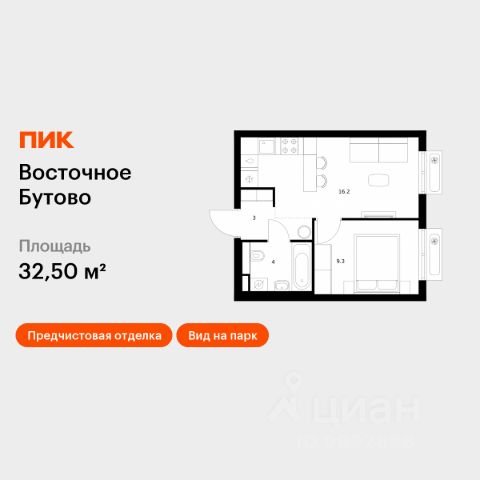 Квартира расположена на 4 этаже 19-этажного панельного дома. Общая площадь составляет 37.8 кв. м, жилая площадь — 17.5 кв. м, просторная кухня — 9.5 кв. м., в прихожей - гардеробная в отдельном помещении. Высокие потолки в 2.8 метра добавляют ощущение простора, хорошая дополнительная звукоизоляция.