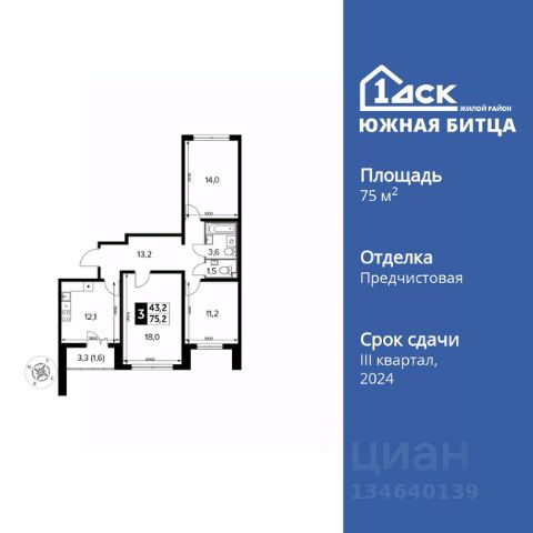 Прямая продажа от застройщика! Семейный жилой район класса Комфорт Плюс Продаётся 3-к квартира номер 112 общей площадью 75.3 кв.м. на 6-м этаже 24 этажного здания. Отделка Whitebox. Цена с учётом скидки. Особенности квартиры: - Гостевой санузел - комфорт и удобство для ваших гостей. - Просторная кухня - место для семейных ужинов и кулинарных экспериментов. - Ниша под шкаф - компактное и удобное место для вещей. - Лоджия - уютное место для отдыха и тишины. - Панорамное остекление лоджии - открывает вид на окружающий мир. Квартира с предчистовой отделкой (White box). Вам не придется заниматься черновыми и трудоёмкими работы, а чистовую отделку и дизайн - сделайте на свой вкус. Информация о комплексе: Сочетание свободного перемещения по внутреннней территории без машин и ощущения абсолютной безопасности благодаря надежным ограждениям - вот что отличает ЖК Южная Битца. На территории комплекса созданы все условия как для активного образа жизни, так и для спокойного времяпрепровождения. Свободно перемещайтесь по внутренней территории в безбарьерной среде! Продуманное зонирование во дворах позволяет отделить тихие зоны для родителей со спящими младенцами и тех, кто хочет почитать на свежем воздухе, от шумных игровых зон. Игровые зоны учитывают возраст детей. Площадки для детей старшего возраста вынесены за пределы дворов. Ощущение уютного дома должно начинаться с подъезда. Мы постарались предусмотреть все нюансы, чтобы наши лифты отвечали самым строгим современным требованиям. А наличие кладовых позволит вам поддерживать идеальный порядок и уют в вашей квартире! Транспортная доступность: В 3 км от МКАД в нескольких минутах езды до трех станций метро: Аннино, Бульвар Дмитрия Донского, улица Старокочаловская и станции МЦД2 - жд Бутово. Внутренняя инфраструктура: Для жителей жилого района "Южная Битца" доступна развитая инфраструктура близлежащих московских районов Чертаново, Южное, Бирюлёво Западное, Северное Бутово и Южное Бутово. Множество образовательных учреждений, объекты здравоохранения, торговые и развлекательные центры, кинотеатры, кафе, рестораны, парки.