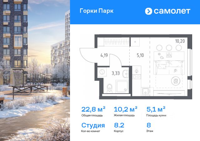 Строим кварталы для жизни с заботой о будущем. Предлагается квартира студия комфорт-класса 22,83 кв.м в корпусе 8.1 на 8 этаже, в ЖК "Горки Парк" Квартира без отделки. Доступность опции "отделка" и возможность комплектации мебелью и декором уточняйте у застройщика. Приобрести квартиру возможно по специальным акциям от застройщика, с текущими условиями акций можно ознакомиться в блоке "Акций". Цена динамическая и может отличаться, уточняйте актуальность у застройщика. Уединенный жилой комплекс, где хочется остаться. До МКАДа всего 10 минут на авто, а прямо рядом с домами есть лес — идеально для прогулок, занятий спортом и медитаций. Фасады 1117-этажных корпусов дополняют яркие вставки — каждый дом особенный. На территории проекта появятся ФОК и поликлиника, детские сады и школы. Наслаждаться счастливой жизнью в квартале можно уже сейчас — здесь есть готовые дома, но при этом появляются и новые корпуса. "Горки Парк" — это: 1. 10 минут на машине до МКАДа 2. 20 минут на машине до метро "Домодедовская" и 18 минут — до аэропорта Домодедово 3. Пешеходные бульвары и пространства для отдыха 4. Выход в лесопарк с благоустроенными экотропами 5. Приватные дворы без машин 6. Экомаршрут в Коробовском лесопарке рядом с домом, который соединит кварталы: "Пригород Лесное", "Горки Парк" и "Богдановский Лес" 7. Запланировано 3 школы и 6 детских садов 8. Уже построили детский сад и школу со спортивным ядром, где смогут тренироваться жители квартала 9. Поликлиника и спорткомплекс внутри проекта 10. Магазины и кофейни на первых этажах 11. Игровые площадки и воркаут-зона 12. Прогулочная зона рядом с кварталом 13. Спортивно-игровой кластер 14. Площадки для занятий йогой и игры в пинг-понг — в части дворов 15. Рабочий остров и площадка для отдыха — в части дворов 16. Веревочный панда-парк — в будущем 17. Площадка для выгула собак 18. Балконы с панорамным остеклением 19. Увеличенные окна в квартирах 20. Входы на уровне земли 21. Места для хранения велосипедов и колясок