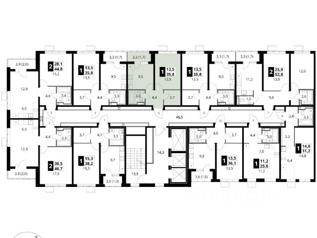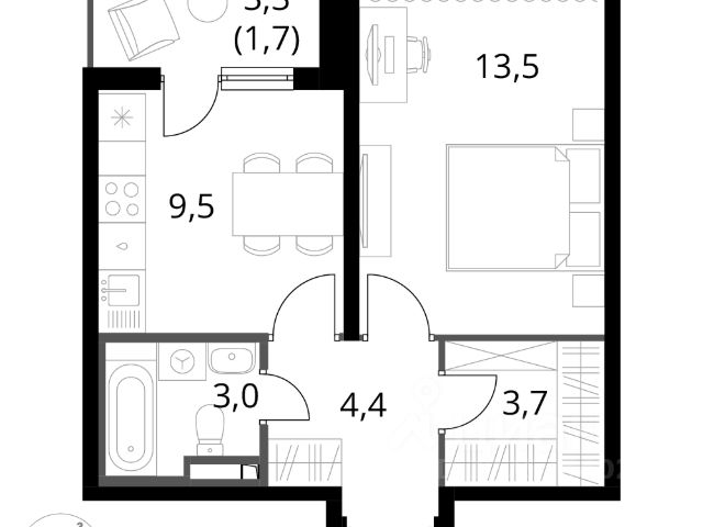 Квартира с кухней-гостиной и двумя спальнями в "Первом квартале". Особенности планировки: мастер-спальня, предчистовая отделка, разнесённые спальни. квартиры в нашей базе: МТК06-Ж3.8.3.