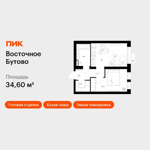 Продаётся 1-комн. квартира площадью 34,6 кв.м на 8 этаже 24 этажного дома (Корпус 43.1, Секция 1) проекта ПИК Восточное Бутово. Светлый просторный подъезд на уровне земли, функциональная планировка, большие окна, c отделкой. Жилой квартал "Восточное Бутово" расположен в 5 км от МКАД по Симферопольскому шоссе, в Ленинском районе Московской области. Это экологически благоприятное место по соседству с Бутовским лесопарком. В 25 минутах на машине - станции метро и МЦД "Бутово". В "Восточном Бутово" уже открылись пять детских садов из десяти запланированных и одна школа из четырёх. Внутри квартала будет две поликлиники, одна из которых уже работает. В проекте два пешеходных бульвара - по одному из них уже можно гулять и кататься на велосипеде. В закрытых дворах-парках не будет автомобилей - мы построим многоуровневый паркинг, чтобы сделать район ещё более комфортным и безопасным для жителей. Артикул 1043005 (Застройщик ООО "Лотан")