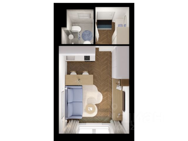 - планировка: кухня-гостиная (15,6 кв.м.), прихожая (3 кв.м.), санузел (2,6 кв.м.).