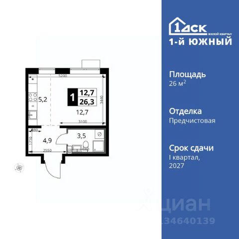 - Общая площадь: 27,7 м2