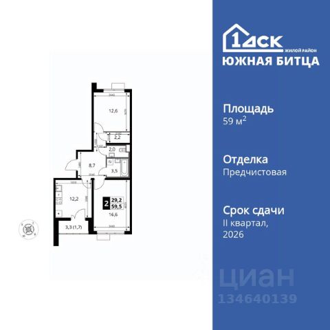 Прямая продажа от застройщика! Семейный жилой район класса Комфорт Плюс Продаётся 2-к квартира номер 466 общей площадью 59.1 кв.м. на 9-м этаже 22 этажного здания. Отделка Whitebox. Особенности квартиры: - Линейная планировка - максимальная функциональность и удобство. - Гостевой санузел - комфорт и удобство для ваших гостей. - Раздельный санузел - больше удобства для всех членов семьи. - Просторная кухня - место для семейных ужинов и кулинарных экспериментов. - Гардеробная - удобство для хранения и организации вещей. - Лоджия - уютное место для отдыха и тишины. Квартира с предчистовой отделкой (White box). Вам не придется заниматься черновыми и трудоёмкими работы, а чистовую отделку и дизайн - сделайте на свой вкус. Информация о комплексе: Сочетание свободного перемещения по внутреннней территории без машин и ощущения абсолютной безопасности благодаря надежным ограждениям - вот что отличает ЖК Южная Битца. На территории комплекса созданы все условия как для активного образа жизни, так и для спокойного времяпрепровождения. Свободно перемещайтесь по внутренней территории в безбарьерной среде! Продуманное зонирование во дворах позволяет отделить тихие зоны для родителей со спящими младенцами и тех, кто хочет почитать на свежем воздухе, от шумных игровых зон. Игровые зоны учитывают возраст детей. Площадки для детей старшего возраста вынесены за пределы дворов. Ощущение уютного дома должно начинаться с подъезда. Мы постарались предусмотреть все нюансы, чтобы наши лифты отвечали самым строгим современным требованиям. А наличие кладовых позволит вам поддерживать идеальный порядок и уют в вашей квартире! Транспортная доступность: В 3 км от МКАД в нескольких минутах езды до трех станций метро: Аннино, Бульвар Дмитрия Донского, улица Старокочаловская и станции МЦД2 - жд Бутово. Внутренняя инфраструктура: Для жителей жилого района "Южная Битца" доступна развитая инфраструктура близлежащих московских районов Чертаново, Южное, Бирюлёво Западное, Северное Бутово и Южное Бутово. Множество образовательных учреждений, объекты здравоохранения, торговые и развлекательные центры, кинотеатры, кафе, рестораны, парки. Купить квартиру с отделкой в поселке Битца Московской области.