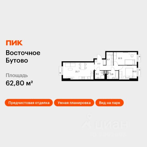 Продаётся 2-комн. квартира площадью 46 кв.м на 24 этаже 25 этажного дома (Корпус 47, Секция 3) проекта ПИК Восточное Бутово. Светлый просторный подъезд на уровне земли, функциональная планировка, большие окна, предчистовая отделка. Жилой квартал "Восточное Бутово" расположен в 5 км от МКАД по Симферопольскому шоссе, в Ленинском районе Московской области. Это экологически благоприятное место по соседству с Бутовским лесопарком. В 25 минутах на машине - станции метро и МЦД "Бутово". В "Восточном Бутово" уже открылись пять детских садов из десяти запланированных и одна школа из четырёх. Внутри квартала будет две поликлиники, одна из которых уже работает. В проекте два пешеходных бульвара - по одному из них уже можно гулять и кататься на велосипеде. В закрытых дворах-парках не будет автомобилей - мы построим многоуровневый паркинг, чтобы сделать район ещё более комфортным и безопасным для жителей. Артикул 1012851 (Застройщик ООО "Лотан")