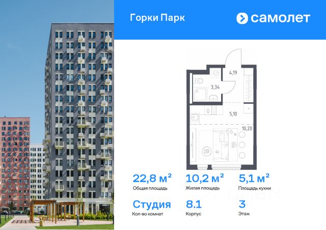 Строим кварталы для жизни с заботой о будущем. Предлагается квартира студия комфорт-класса 22,28 кв.м в корпусе 6.1 на 17 этаже, в ЖК "Горки Парк" Квартира без отделки. Доступность опции "отделка" и возможность комплектации мебелью и декором уточняйте у застройщика. Приобрести квартиру возможно по специальным акциям от застройщика, с текущими условиями акций можно ознакомиться в блоке "Акций". Цена динамическая и может отличаться, уточняйте актуальность у застройщика. Уединенный жилой комплекс, где хочется остаться. До МКАДа всего 10 минут на авто, а прямо рядом с домами есть лес — идеально для прогулок, занятий спортом и медитаций. Фасады 1117-этажных корпусов дополняют яркие вставки — каждый дом особенный. На территории проекта появятся ФОК и поликлиника, детские сады и школы. Наслаждаться счастливой жизнью в квартале можно уже сейчас — здесь есть готовые дома, но при этом появляются и новые корпуса. "Горки Парк" — это: 1. 10 минут на машине до МКАДа 2. 20 минут на машине до метро "Домодедовская" и 18 минут — до аэропорта Домодедово 3. Пешеходные бульвары и пространства для отдыха 4. Выход в лесопарк с благоустроенными экотропами 5. Приватные дворы без машин 6. Экомаршрут в Коробовском лесопарке рядом с домом, который соединит кварталы: "Пригород Лесное", "Горки Парк" и "Богдановский Лес" 7. Запланировано 3 школы и 6 детских садов 8. Уже построили детский сад и школу со спортивным ядром, где смогут тренироваться жители квартала 9. Поликлиника и спорткомплекс внутри проекта 10. Магазины и кофейни на первых этажах 11. Игровые площадки и воркаут-зона 12. Прогулочная зона рядом с кварталом 13. Спортивно-игровой кластер 14. Площадки для занятий йогой и игры в пинг-понг — в части дворов 15. Рабочий остров и площадка для отдыха — в части дворов 16. Веревочный панда-парк — в будущем 17. Площадка для выгула собак 18. Балконы с панорамным остеклением 19. Увеличенные окна в квартирах 20. Входы на уровне земли 21. Места для хранения велосипедов и колясок