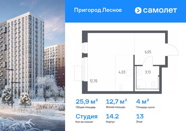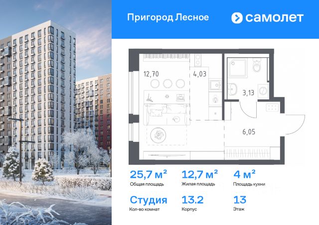 Строим кварталы для жизни с заботой о будущем. Предлагается квартира студия комфорт-класса 26,13 кв.м в корпусе 21 на 13 этаже, в ЖК "Пригород Лесное" Квартира с чистовой отделкой. Доступность дополнительных опций уточняйте у застройщика. Приобрести квартиру возможно по специальным акциям от застройщика, с текущими условиями акций можно ознакомиться в блоке "Акций". Цена динамическая и может отличаться, уточняйте актуальность у застройщика. Жилой комплекс "Пригород Лесное" находится в 7 км от МКАДа. Все корпуса проекта не выше 17 этажей, в отделке фасадов используется кирпич в природных оттенках: сером, коричневом, черном и белом. Жизнь рядом с лесом — это новые впечатления каждый день. Здесь можно устраивать пикники на солнечных лужайках, ходить за ягодами, кататься на велосипедах по извилистым дорожкам. Для жителей — собственные детские сады и школы, поликлиника и больница, паркинги подземные с зарядками для электрокаров, отдельные многоэтажные паркинги и плоскостные парковки. Стройте комфортную и счастливую жизнь в "Пригороде Лесное" уже сейчас. "Пригород Лесное" — это: 1. 15 минут на автомобиле до станции метро "Домодедовская" и 12 минут на автомобиле до МКАДа 2. 8 минут на автомобиле до Каширского шоссе и трассы А-105 3. Коробовский и Богдановский лес, река Пахра и Большой Людовинский пруд у дома 4. Экомаршрут в Коробовском лесопарке рядом с домом, который соединит кварталы: "Пригород Лесное", "Горки Парк" и "Богдановский Лес" 5. Выход в лес по благоустроенным экотропам 6. Уже открыто 3 школы, 5 детских садов и поликлиника 7. Запланированные 17 детских садов и 9 школ, поликлиника и больница 8. Запланированное строительство культурно-досугового и торгового центра, спортивный комплекс и бассейн 9. Детские площадки с безопасным покрытием и велодорожки на территории проекта 10. Собственный ландшафтный парк и бульвар 11. Спортхаб на территории проекта 12. Паркинги: подземные с зарядками для электрокаров, отдельные многоэтажные и плоскостные 13. Колясочные и кладовые помещения
