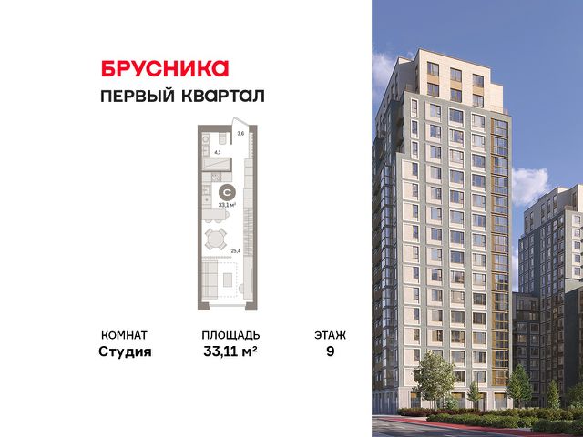 Студия в "Первом квартале". Особенности планировки: предчистовая отделка. квартиры в нашей базе: МТК02-Ж4.9.3.
