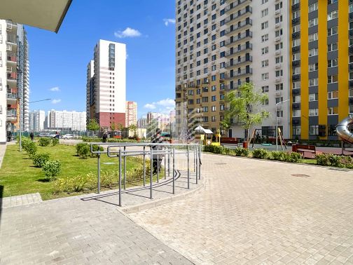 Закрытая благоустроенная территория детские площадки с безопасным покрытием, тренажёры для взрослых, зоны отдыха с лавочками и газонами.