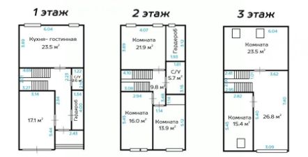 - В доме 3 этажа, каждый этаж по 52-55 м.кв по полу.